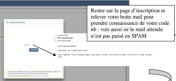 A la fin de la procédure d’enregistrement, un mail vous est envoyé pour confirmer votre inscription en rentrant un code d’accès sur la page d’inscription du SVE en cours.